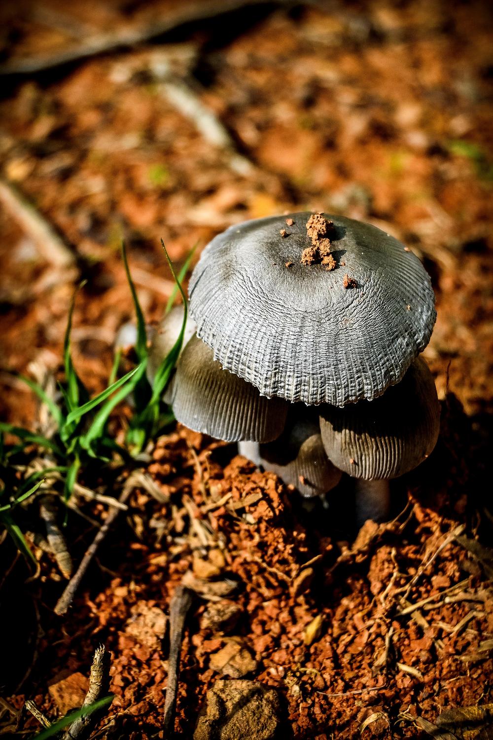 Top-down shot of a larger mushroom with smaller caps underneath.