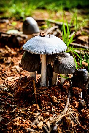 A family of grey and white mushrooms.